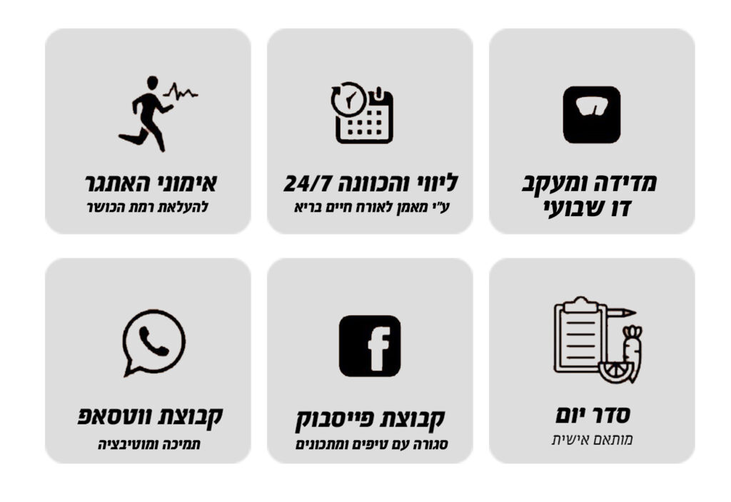 אתגר 90 הימים מתבצע בליווי צמוד של מומחים בתחום, להשגת תוצאות משמעותיות תוך זמן קצר וריאלי בנוסף, כל משתתף מקבל סל מוצרים איכותי, המספק את ההשלמה הנחוצה לתצרוכת היומית של ויטמינים,מינרלים וחלבונים כל אלו מגובים בתמיכה קבוצתית מכילה וחמה, הזמינה למשתתף 24/7 בידי צוות המומחים והמשתתפים האחרים בקהילת האתגר בוואטסאפ ובפייסבוק.